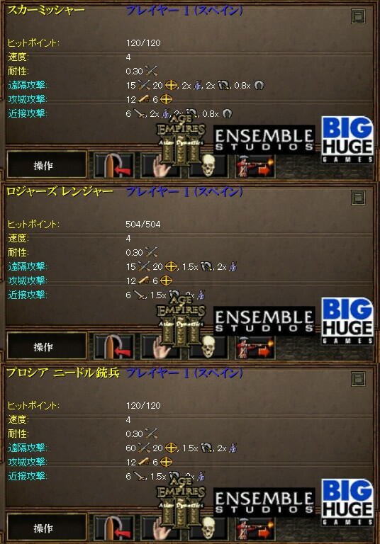 通常のスカミはHP120、攻撃力15、遠隔防御30%なので、スカミ対ロジャーズレンジャーの場合は48発、12発、スカミ対プロシアニードル銃兵の場合は12発、3発で相手を倒せるようになっています。