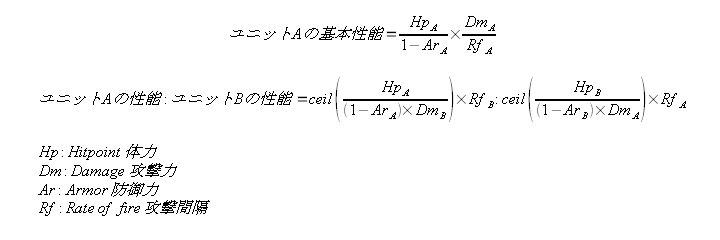 ユニットの性能に関する公式が文字だと分かりにくいので画像にまとめました。